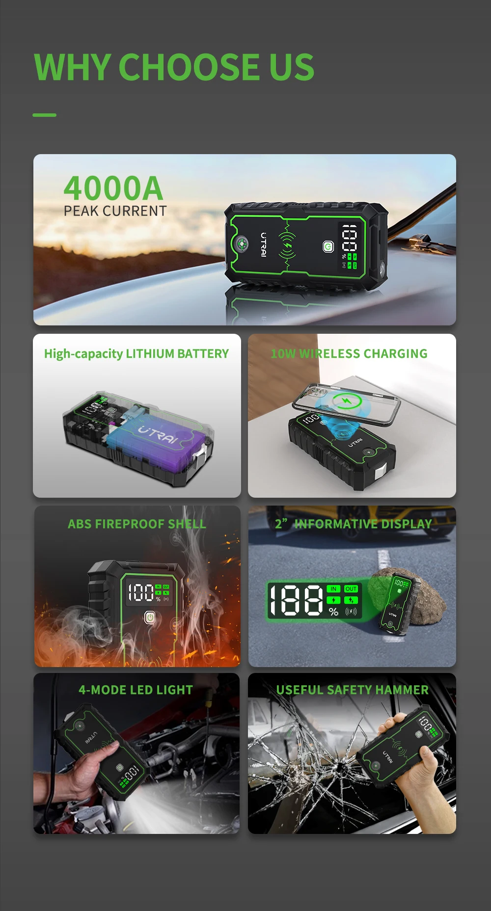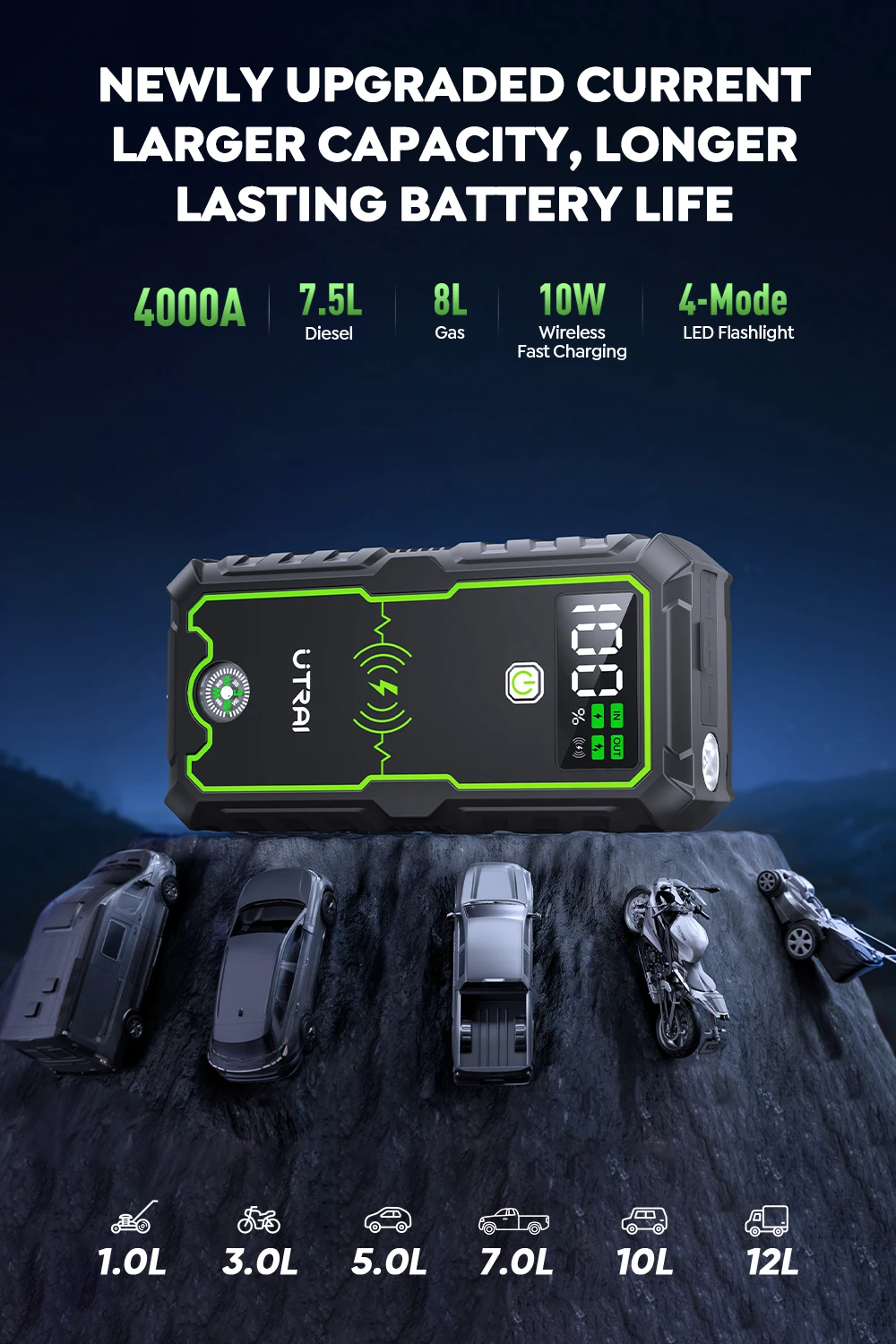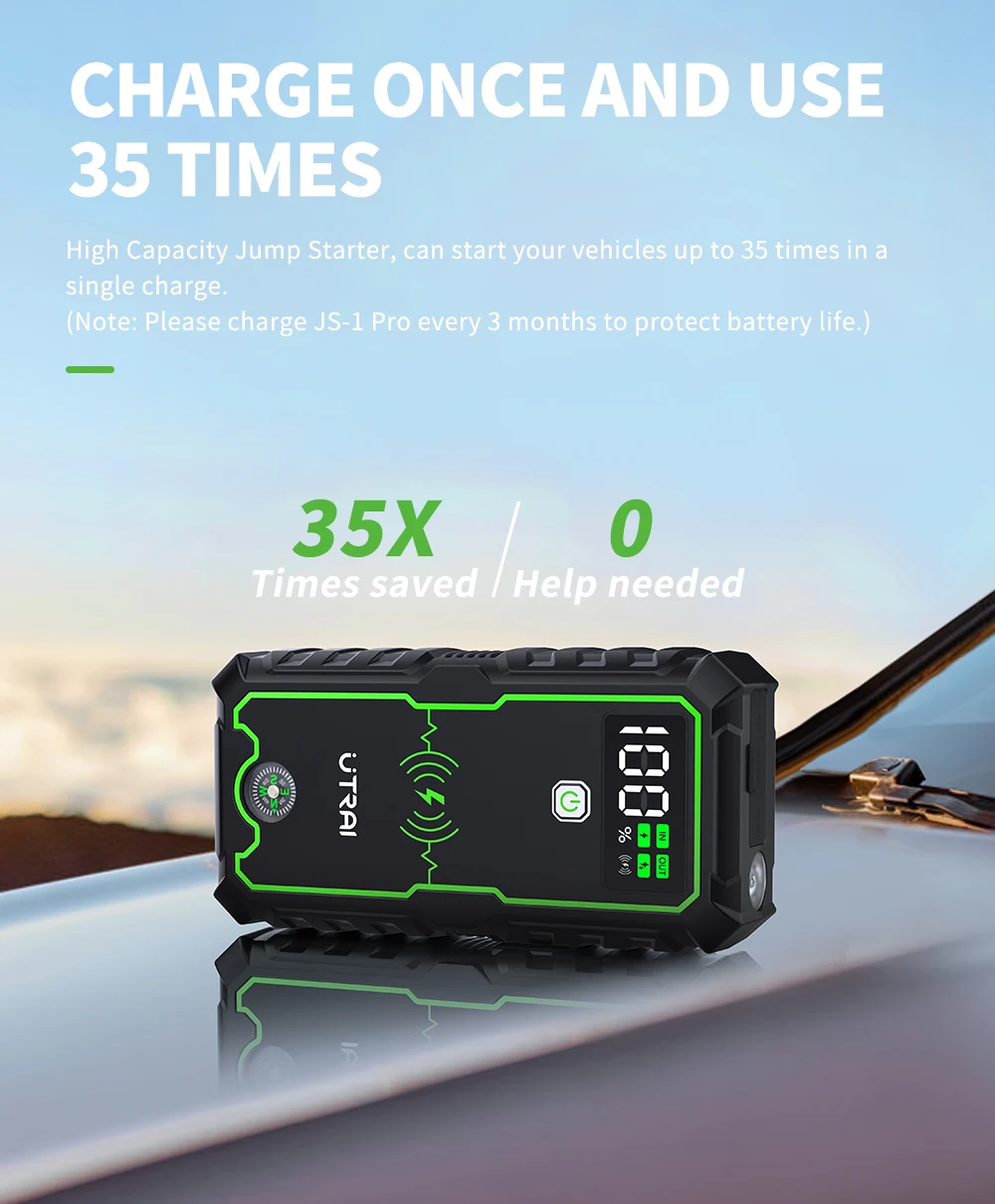 At Merakta, the Car Jump Starter 4000A - 16000mAh from UTRAI is a powerful and portable solution to keep your vehicle running smoothly. With a 4000A peak output and 16000mAh capacity, it can jump-start most gasoline and diesel engines quickly and efficiently. It also features 10W wireless charging for smartphones and other devices, making it a versatile emergency power solution.