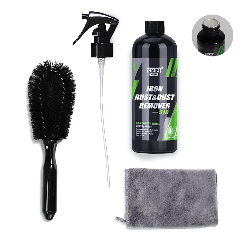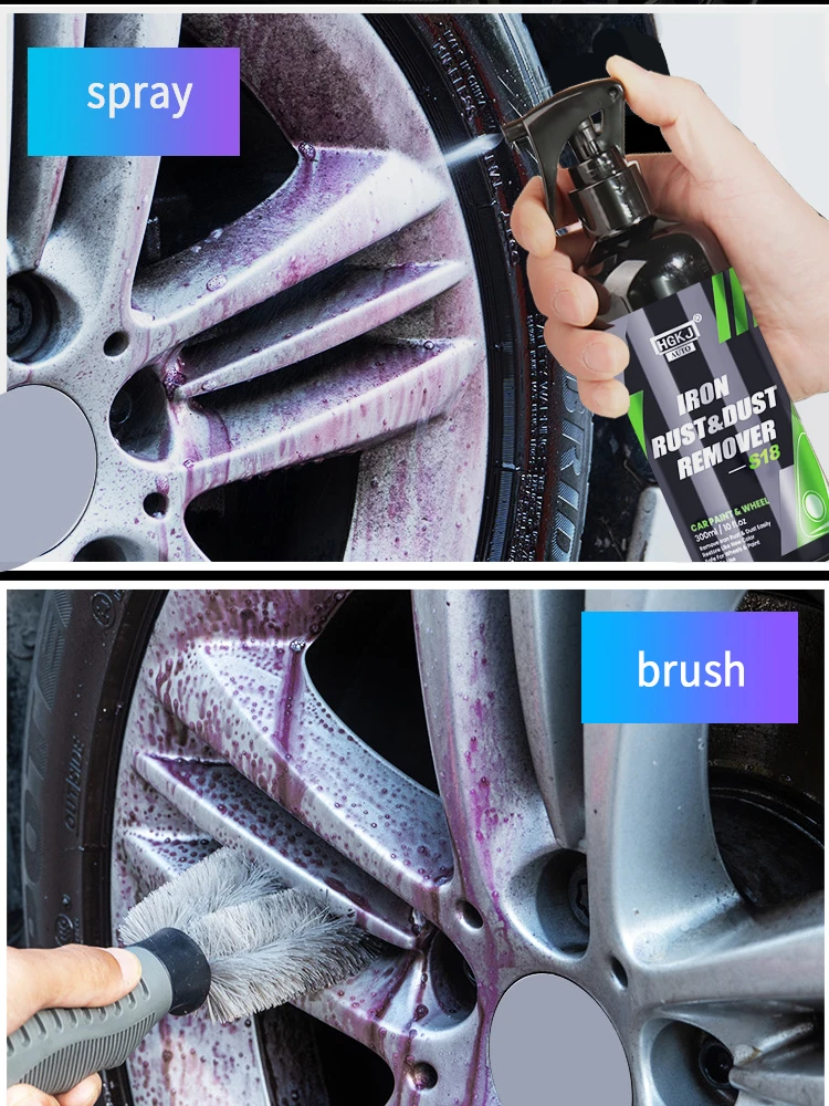 HGKJ S18 releases iron deposits and other ferrous metal from wheels and lower body panels, then neutralizes the corrosive chemical reaction that leads to rust and paint failure. HGKJ 18 sprays on clear, then turns purple once the specialty iron catalysts react with ferrous metals and the chemical reaction releases embedded contamination so you know when to remove it.