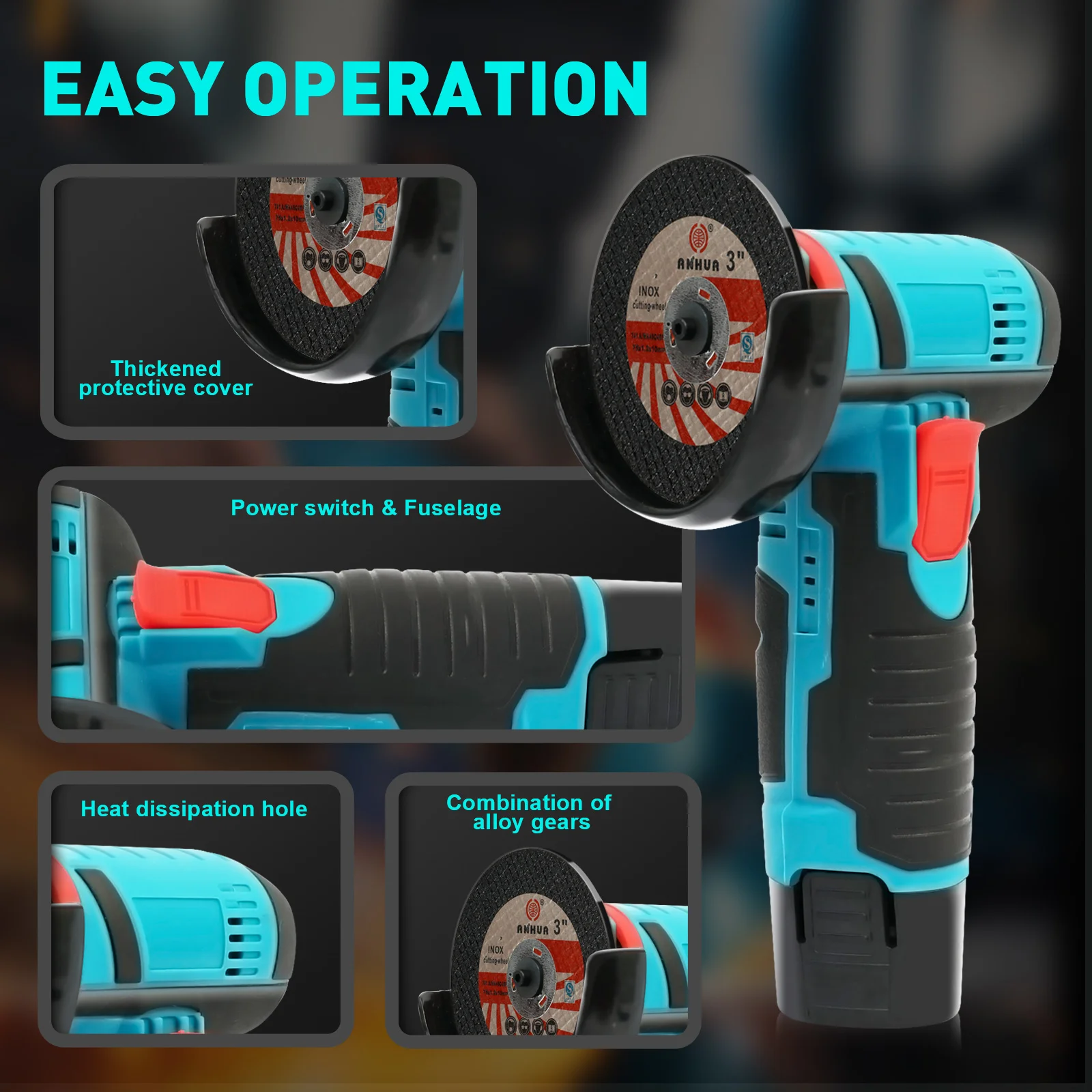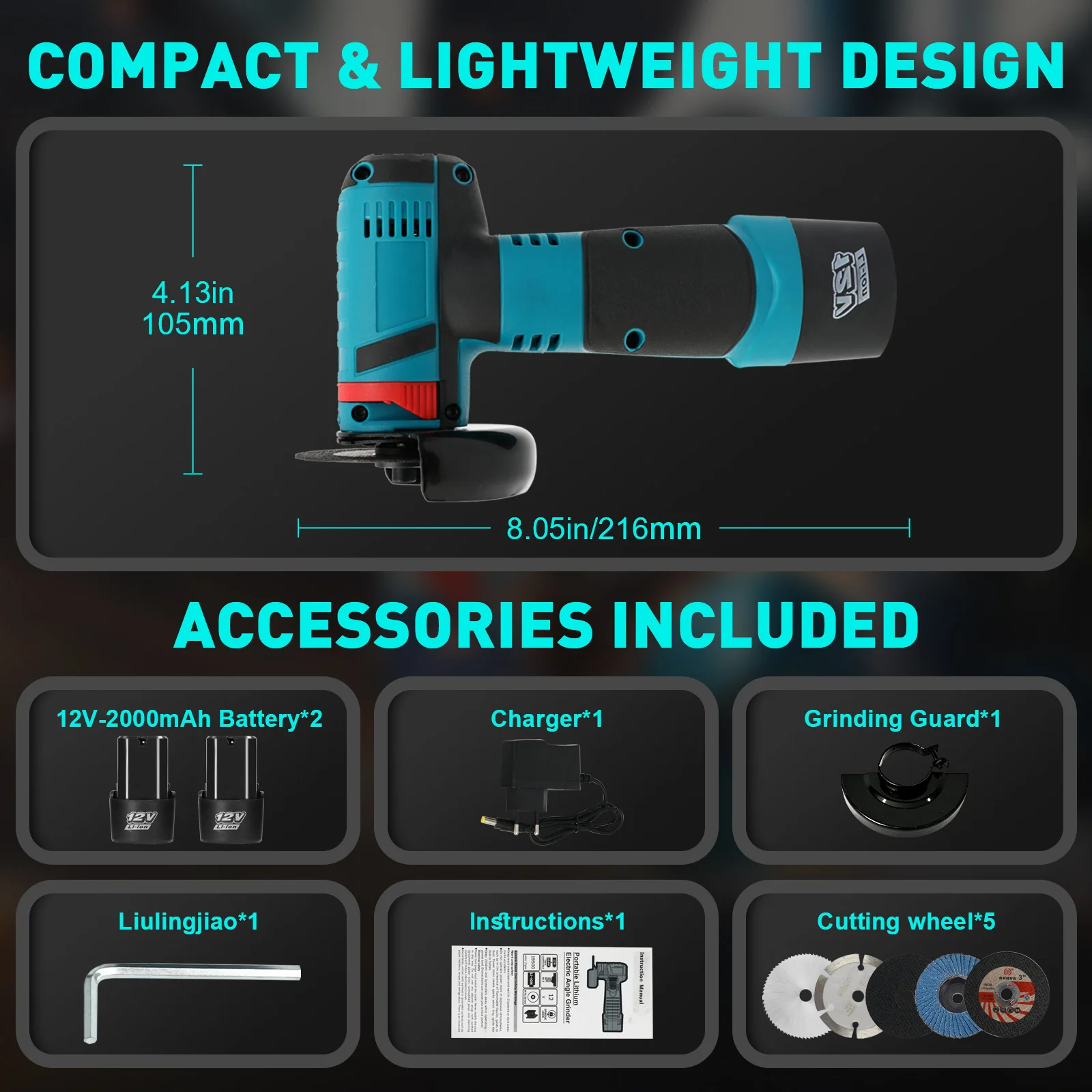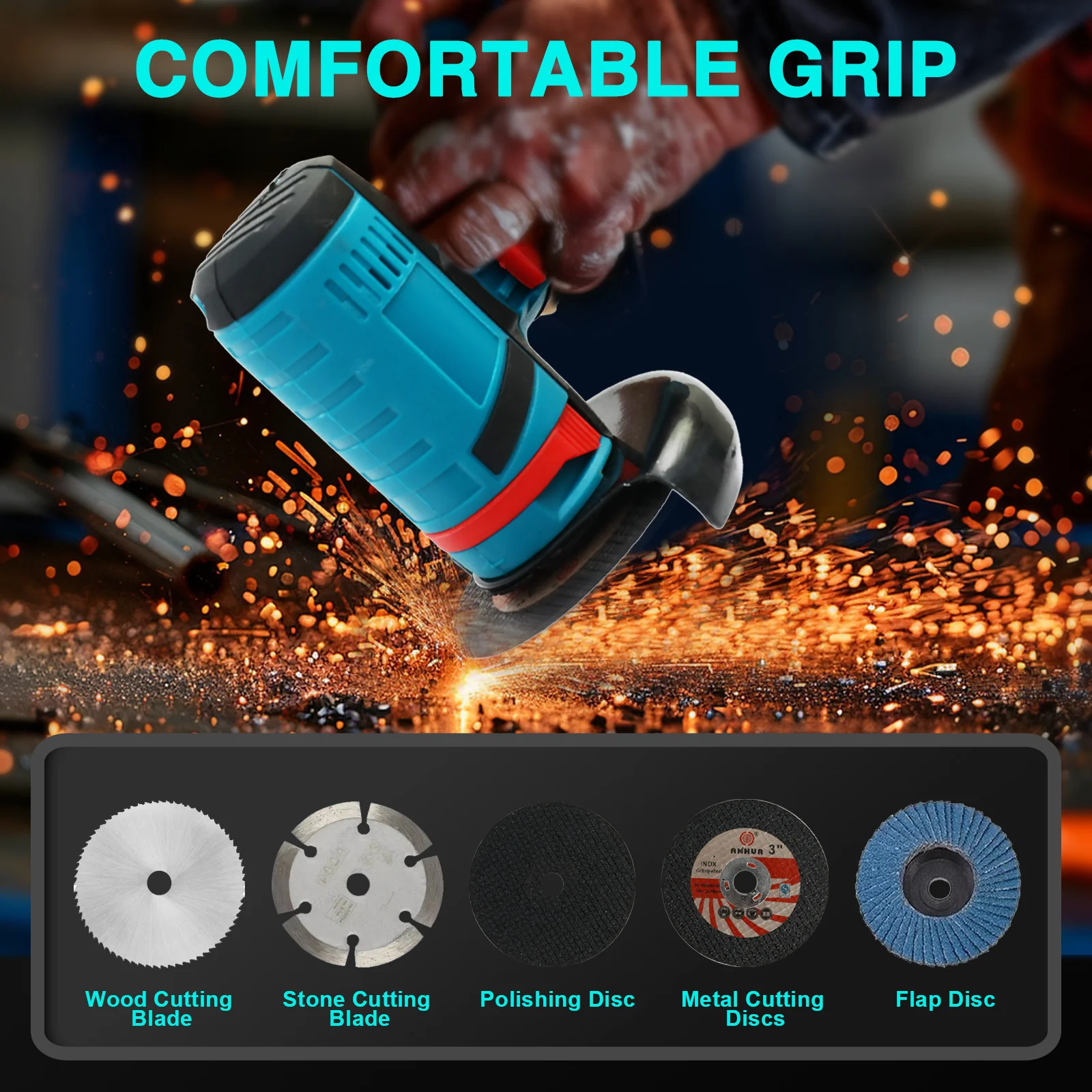 Its ergonomic design ensures precise control and reduces hand fatigue, while the versatile tool handles a variety of tasks including metal grinding, tile cutting, sanding, and polishing. Equipped with two 2000mAh high-capacity batteries and intelligent protection, this angle grinder provides long-lasting performance and safety during every use. Perfect for both DIY enthusiasts and professional craftsmen.
