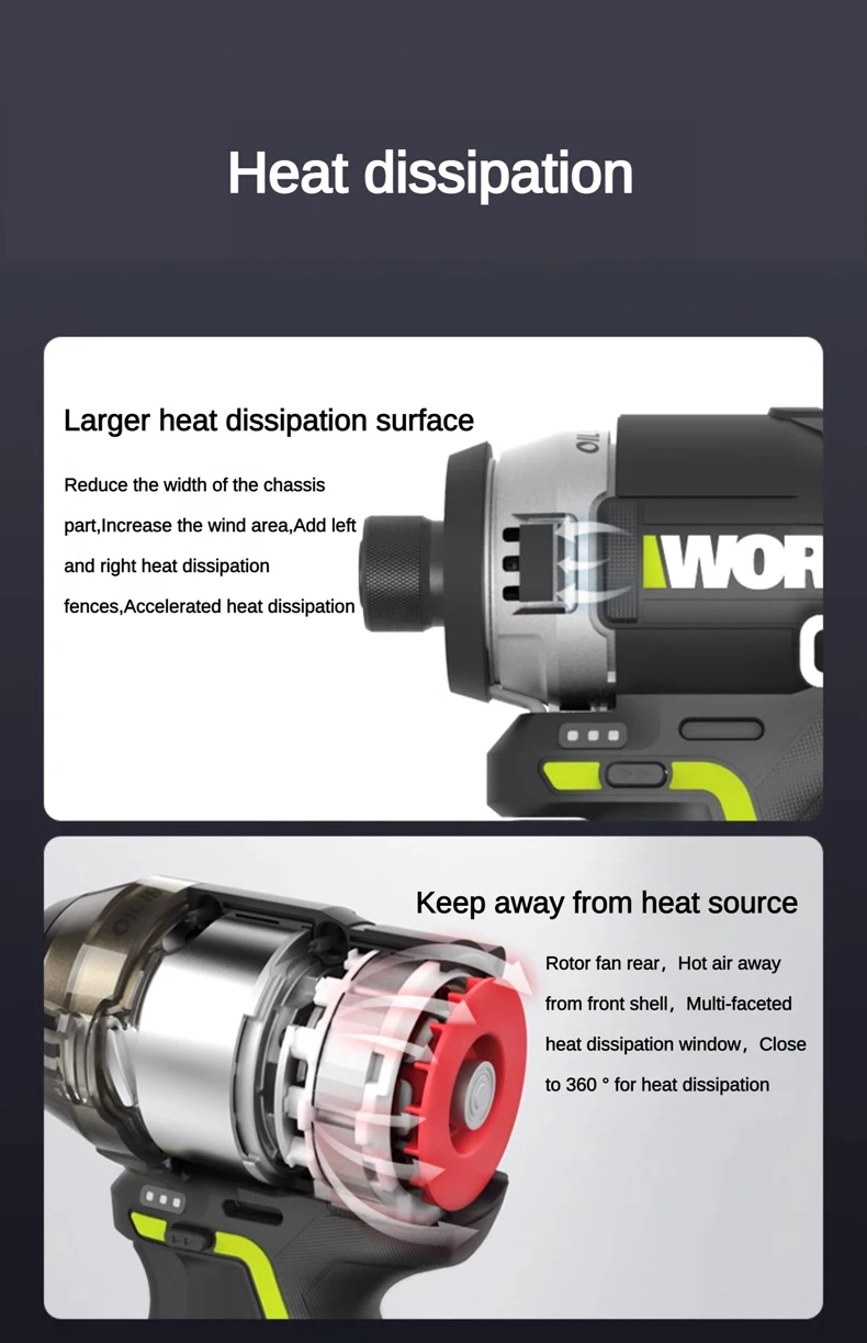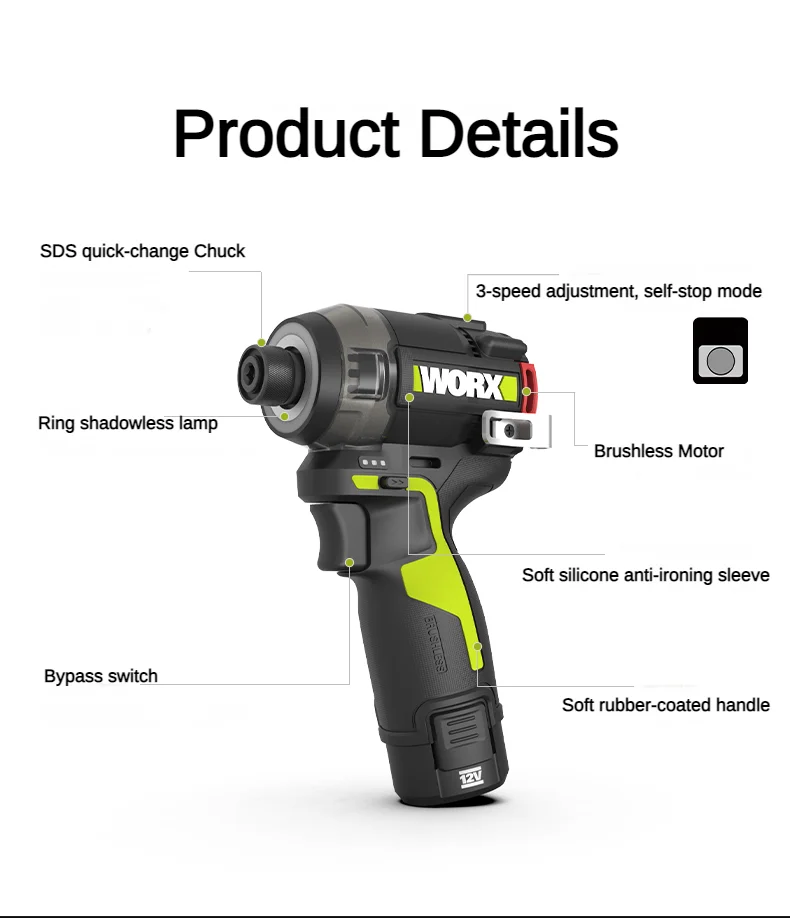 Powered by a 12V brushless motor, the TorquePro WU138 provides 50Nm of torque, 1300 RPM, and up to 4000 BPM, offering precise control for wood, metal, plastic, and other materials. The smart clutch ensures consistent torque application, reducing screw stripping and providing safe, efficient operation. Lightweight and ergonomic, this drill allows extended use without fatigue, featuring a non-slip grip for maximum control.