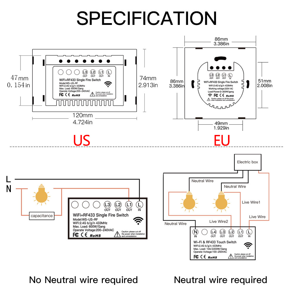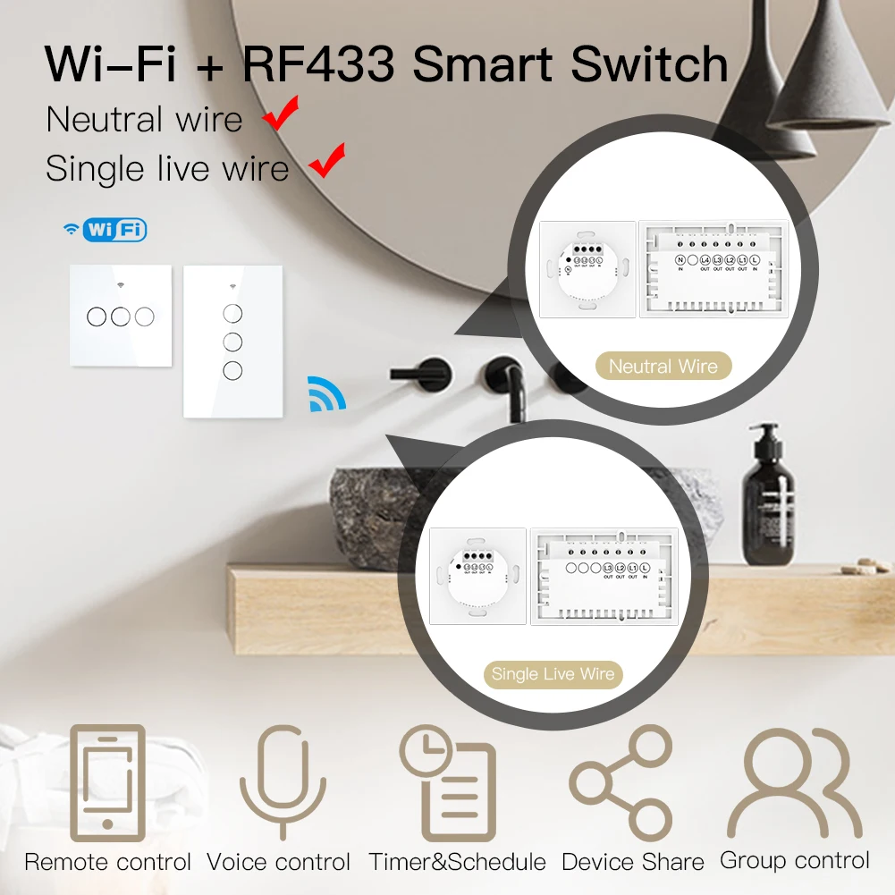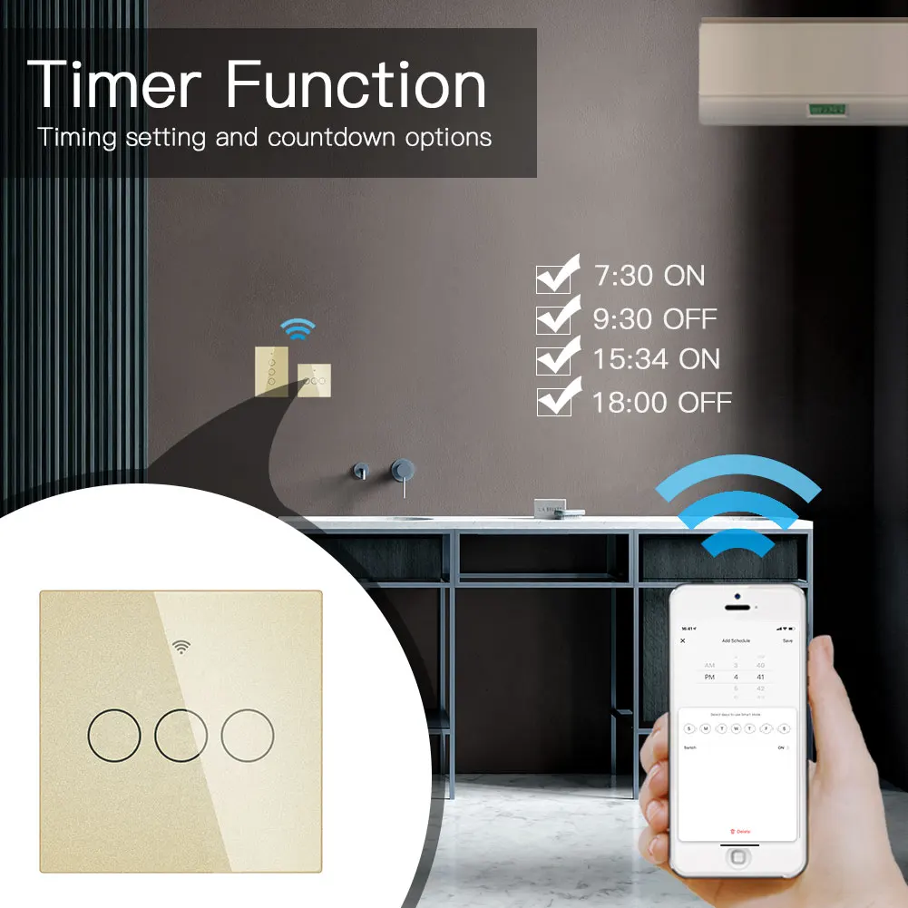 The WiFi Smart Touch Light Switch High Quality features capacitive touch control, optional backlight, and built-in RF433 support for additional remote control. It is compatible with Alexa and Google Home, providing easy voice control. With the upgraded Android and WiFi+Bluetooth pairing, you can set timers, schedules, and share control with family and friends.